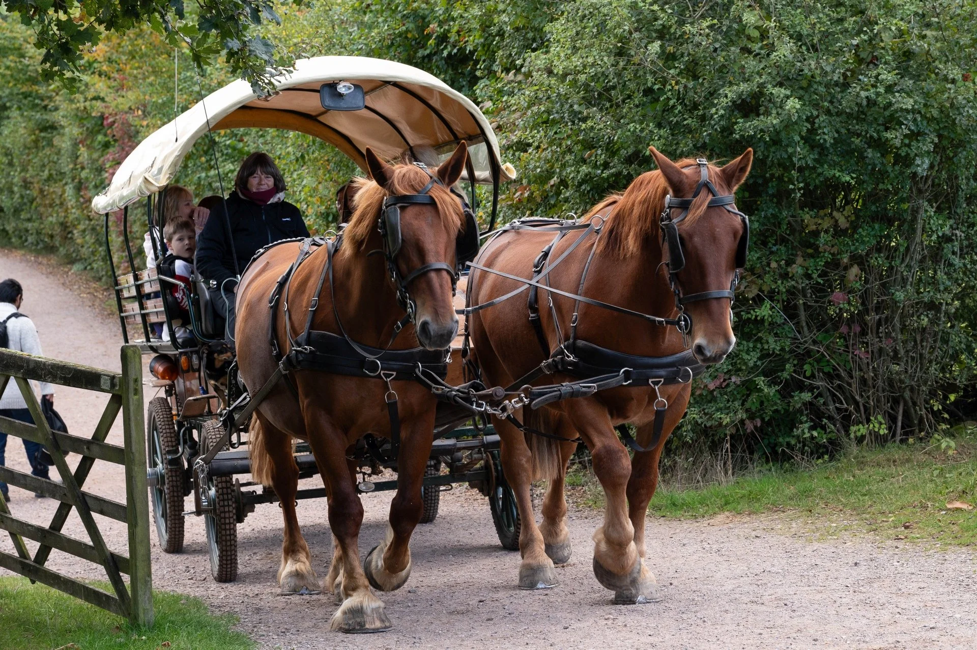 Heavy horses take visitors on carriage rides during the Harvest Festival at the Museum in September 2024